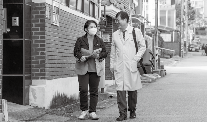 진료실로 찾아오는 환자를 돌보는 것과 비교하면 방문 진료는 훨씬 고되고 번거로운 일이다. 하지만 그는 정당한 보상을 받는 것조차 쑥스러운 듯 고개를 젓는다. 이날 파킨슨병을 앓고 있는 85세 어르신의 집을 찾았다. 간호사인 아내 진경아 씨와 사회복지사들도 뒤를 따랐다. 어르신은 안부를 묻는 통합돌봄사업팀 직원들에게 “내가 사람을 잘 기억 못 한다”라고 미안해한다. 그러면서도”그래도 우리 원장님 얼굴은 기억난다”라며 환하게 웃는다.