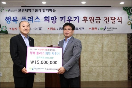 (사진설명 : 10일 종로종합사회복지관에서 진행된 ‘행복 플러스 희망 키우기’ 개강식에서 보령중보재단 조생현 상임이사(사진 좌)가 종로종합사회복지관 이재원 관장(사진 우)에게 프로그램 사업비 전달하고 있다) - 종로, 안산지역 아동들에게 비타민 및 연극을 통한 심리케어 프로그램 지원 - 사회적, 심리적 적응력을 기르고, 정서적 안정과 육체적 건강에도 도움 보령제약그룹 사회복지재단 보령중보재단(이사장 김승호)이 가정의 달인 5월을 맞아 지역 아동들을 위한 건강 케어 지원사업을 펼친다. 보령중보재단은 보령제약그룹이 자리잡고 있는 종로와 안산지역 아동들을 위한 지원사업을 지속적으로 진행해 오고 있다. 올해는 건강을 책임지는 토탈헬스케어기업으로서 지역 아동들의 건강을 위해 보령수앤수의 ‘비타브라보 레몬맛’ 비타민을 종로구 12개 지역아동센터 아동 260명과 경기도 내 다문화가정 아동들이 다니는 지역아동센터 8개소 190명, 총 450명의 어린이들에게 선물했다. 보령중보재단은 이번 지원을 시작으로 지역아동들에게 지속적으로 비타민을 지원 할 계획이다. 또한 종로종합사회복지관(관장 이재원)과 공동으로 연극을 통해 아이들의 정서발달과 심리적 안정감을 찾아주는 ‘행복 플러스 희망 키우기’ 프로그램도 진행한다. 보령중보재단은 프로그램 진행을 위한 사업비 1,500만원 전액을 지원한다. 연극을 통한 심리케어 프로그램인 ‘행복 플러스 희망 키우기’ 는 참여 아이들이 연극공연을 보고, 직접 배우가 되어 연극을 해보면서 정서적 안정과 창의성, 표현력을 높여 사회적, 심리적 적응력을 기르고, 육체적 건강도 함께 성장시킬 수 있도록 한 프로그램이다. 보령중보재단 조생현 상임이사는 “우리의 미래를 이끌고 나갈 어린이들의 건강은 그 무엇보다 중요하다”고 말하고 “단순한 경제적 지원보다는 아동들에게 육체적 건강과 정서적 안정에 직접적으로 도움이 될 수 있는 프로그램을 지속적으로 지원하는 것”이라고 말했다. -