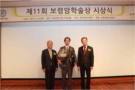 (사진1 : 제 11회 보령암학술상 수상자로 선정된 서영준 교수(가운데)와 한국암연구재단 김병국이사장(오른쪽), 보령제약그룹 김승호회장(왼쪽) 시상식을 마치고 기념사진을 찍고 있다.) 서교수는 세포내 신호전달 네트워크를 표적으로 하는 발암기전 연구와 이를 제어하는 화학암예방 분야 연구, 화학적 암예방, 염증에 의한 발암촉진 기전연구, 스트레스에 대한 세포의 방어기전 연구에 대한 공로를 인정받아 수상하게 됐다. 시상식은 20일 오전 서울대학교 삼성암연구동에서 진행되었으며, 서교수에게 상패와 상금 3천 만원이 수여됐다. 서교수는 세포 내 신호전달 네트워크를 표적으로 하는 발암기전 연구와 이를 제어하는 화학암예방(Cancer Chemoprevention) 분야 연구로 SCI(과학기술논문 인용색인)급 국제학술지에 200여편의 논문을 발표하였으며, 총 피인용 누적 횟수, 8,000여회 (self-citation 제외)를 기록하며 국제적으로도 연구성과를 인정받고 있다. 또한 기타 CRC Press, Taylor & Francis, Springer-Verlag등 국제 유수 출판사에서 간행되는 단행본 3권을 집필하기도 했다. 현재는 교육과학기술부/한국연구재단 지정 종양미세환경 글로벌핵심연구센터(GCRC) 센터장으로 재직하면서 암세포와 주변세포간의 상호작용을 다학제적으로 조명하는 연구를 수행하고 있다. 서교수는 1990 미국 MIT 대학 박사 후 연구원을 거쳐 1992년에는 미국 예일대학교 의과대학 조교수로 근무했으며, 1996년부터 서울대학교 약학대학 교수로 재직 중이다. 또한 현재 대한암예방학회 부회장, 교육과학기술부/한국연구재단 지정 종양미세환경 글로벌핵심연구센터 센터장, 한국프리라디칼학회 회장으로 활동하고 있다. 한편, 서교수는 상금 중 일부를 암연구를 위해 서울대 암연구소에 기부하겠다는 의사를 밝히기도 했다. 보령제약그룹 김승호 회장은 축사를 통해 “서영준 교수님뿐 아니라, 종양학 분야에서 노력하는 많은 분들이 있기에 암정복에 한발짝씩 다가가고 있다”고 말하고 “보령암학술상이 암 연구 활동을 더욱 진작시키고, 격려하는데 조금이나마 보탬이 되고, 건강한 사회구현에 초석이 되었으면 한다”는 바람을 밝혔다. ‘보령암학술상’은 2002년 국내 종양학 분야 연구에서 국민보건향상에 기여해 온 학자들의 업적을 기리고, 국내 종양학 분야의 학술활동을 진작하기 위해 한국암연구재단과 보령제약이 공동으로 제정해 매년1명을 수상자로 선정하고 있으며, 올해로 11회를 맞이했다. # # #