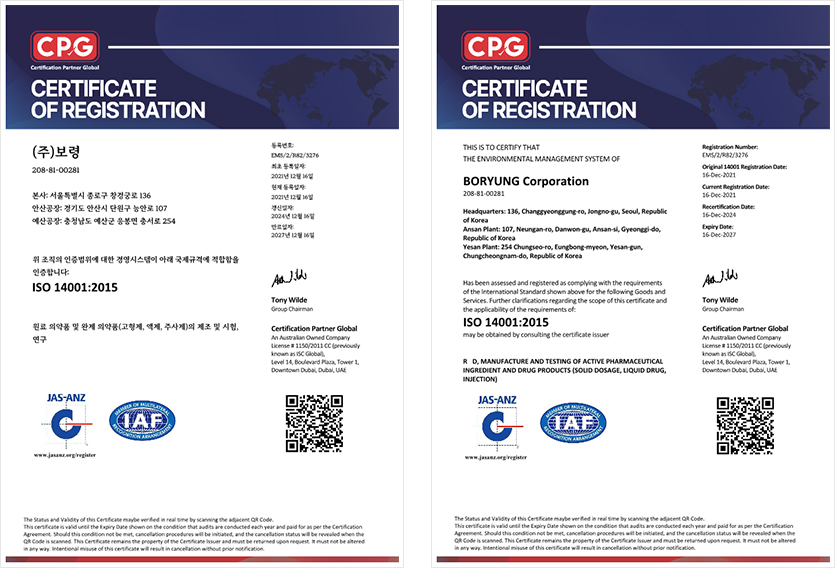 ISO 14001 환경경영시스템은 환경경영에 대한 국제 인증제도로서, 2021년 최초 인증 받았습니다.
