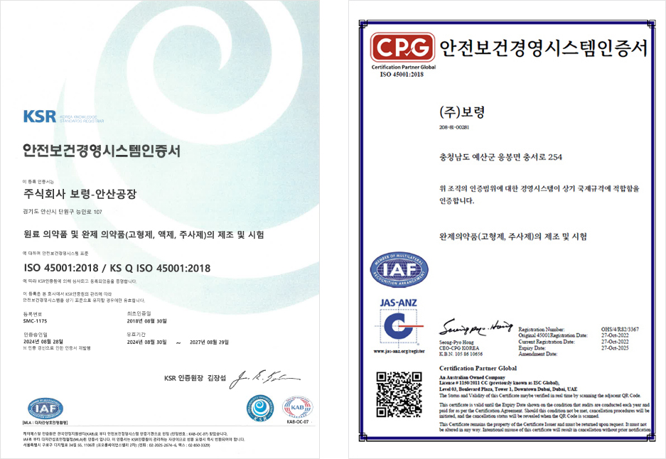 ISO 45001 안전보건경영시스템은 안전보건분야 국제표준인증으로, 안산공장은 2018년 최초 인증 이후 2021년 갱신하였으며, 예산공장은 2022년 10월 27일 최초 인증받았습니다.
