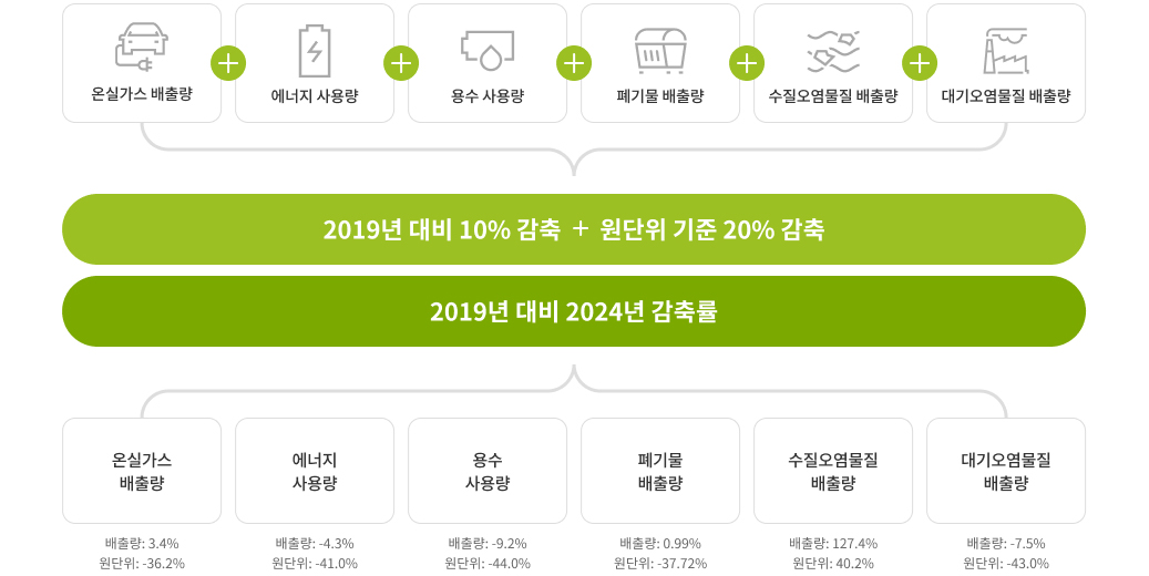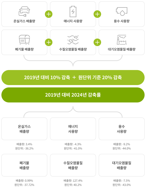 | 구분 | 온실가스 배출량 | 에너지 사용량 | 용수 사용량 | 수질오염물질 배출량 | 대기오염물질 배출량 | 폐기물 배출량 | |