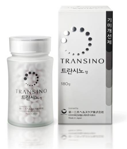 트란시노는 2007년 일본 다이이치산쿄헬스케어에서 개발한 새로운 개념의 기미치료제로, 3상 임상 시험까지 완료한 효과가 검증된 치료제다.