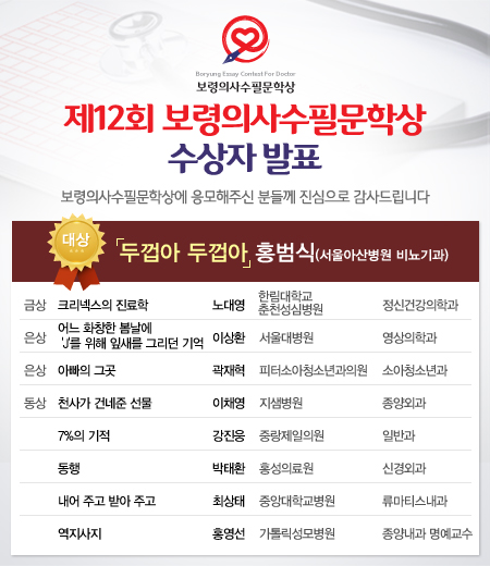 제정해 시상하고 있는 제12회 보령의사수필문학상 대상에 서울 아산병원 홍범식교수 작품 ‘두껍아 두껍아’가 선정됐다. 시상식은 22일 오후 7시 보령제약 본사 중보홀에서 진행될 예정이다.
