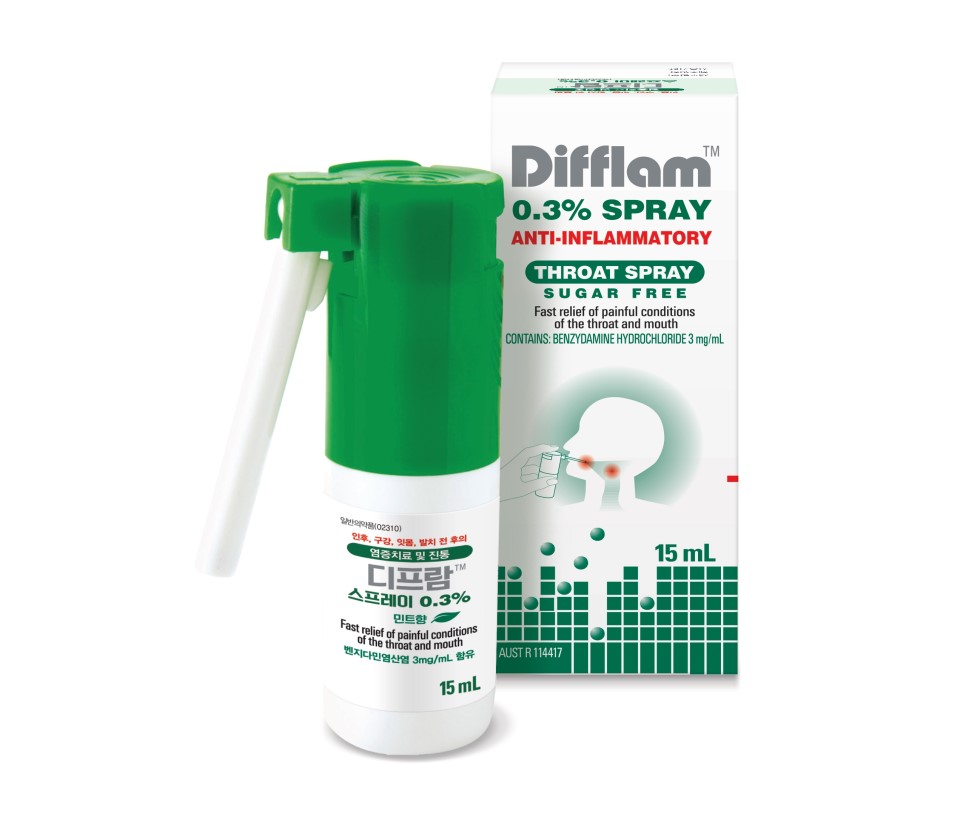 디프람 스프레이 0.3%는 주성분인 벤지다민염산염이 3가지 효능(Triple-Action)을 통해 인후, 구강, 잇몸, 발치전후의 염증치료(Analgesic), 진통완화(Anti-inflammatory), 국소마취(Anaesthetic-local) 효과를 나타내는 제품이다. 벤지다민염산염은 부어 오른 부위에 선택적으로 작용해 통증을 감소시키며, 세포막 안정화를 통해 염증의 원인을 억제시켜 염증과 부종을 감소시킨다. 인후염과 편도선염 환자에서 치료 3일 후 75%의 탁월한 개선도를 보여주었다. 또한 디프람 스프레이를 뿌린 국소 부위의 감각을 둔하게 만들어 음식 섭취와 목넘김이 힘든 인후염, 구내염 환자들에게 뛰어난 효과를 나타낸다.