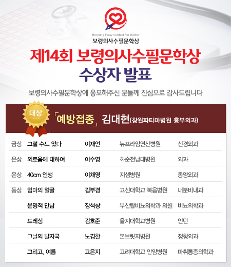 보령제약이 제정해 시상하고 있는 제14회 보령의사수필문학상 대상에 창원파티마병원 김대현과장의 작품 ‘예방접종’이 선정됐다. 시상식은 11일 오후 6시 30분 보령제약 본사 중보홀에서 진행될 예정이다.