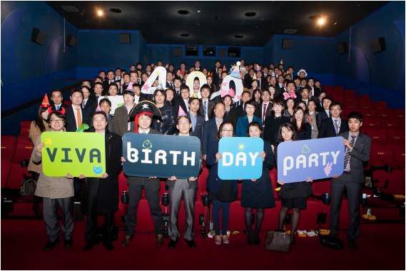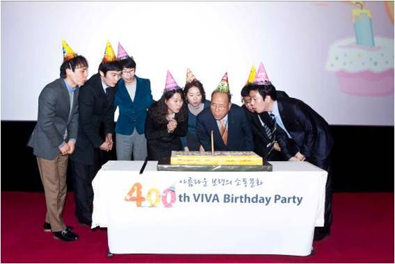 6일 대학로 CGV에서 열린 400회 생일파티에는 김승호회장, 김은선부회장 및 각 계열사 대표와 그룹 임원들을 포함한 임직원 200여 명이 참석한 가운데 진행됐다.
