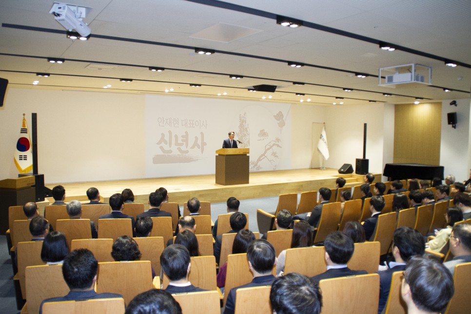 (사진설명: 2일 종로구 보령제약 본사 중보홀에서 진행 된 ‘2020년 시무식’에서 안재현대표가 신년사를 발표하고 있다.)
