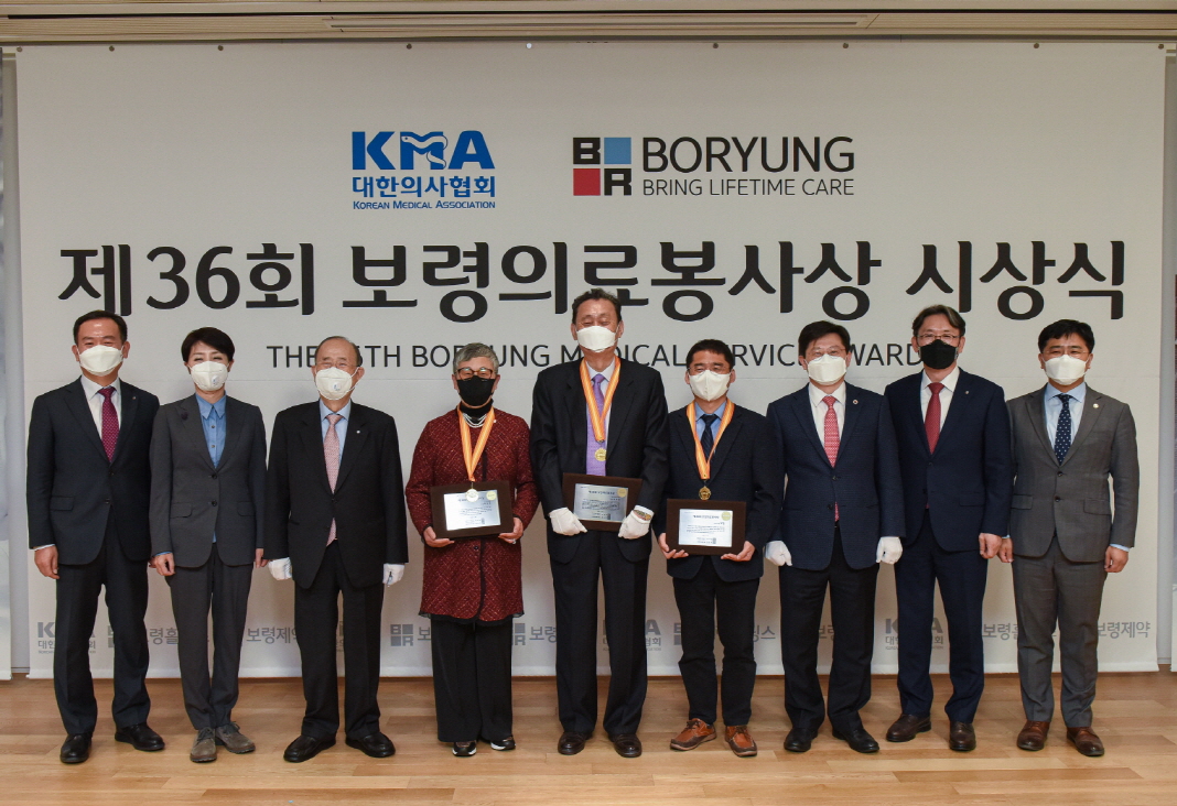 <사진설명 : 제36회 보령의료봉사상 시상식 기념사진(왼쪽 첫번째부터 보령제약 이삼수대표, 보령홀딩스 김은선회장, 보령제약그룹 김승호회장, 한국여자의사회 이향애회장, 한국전립선관리협회 권성원회장, 글로벌케어 백은성대표, 대한의사협회 박홍준부회장, 보령제약 안재현사장, 대한의사협회 박종혁 홍보이사 겸 대변인)>