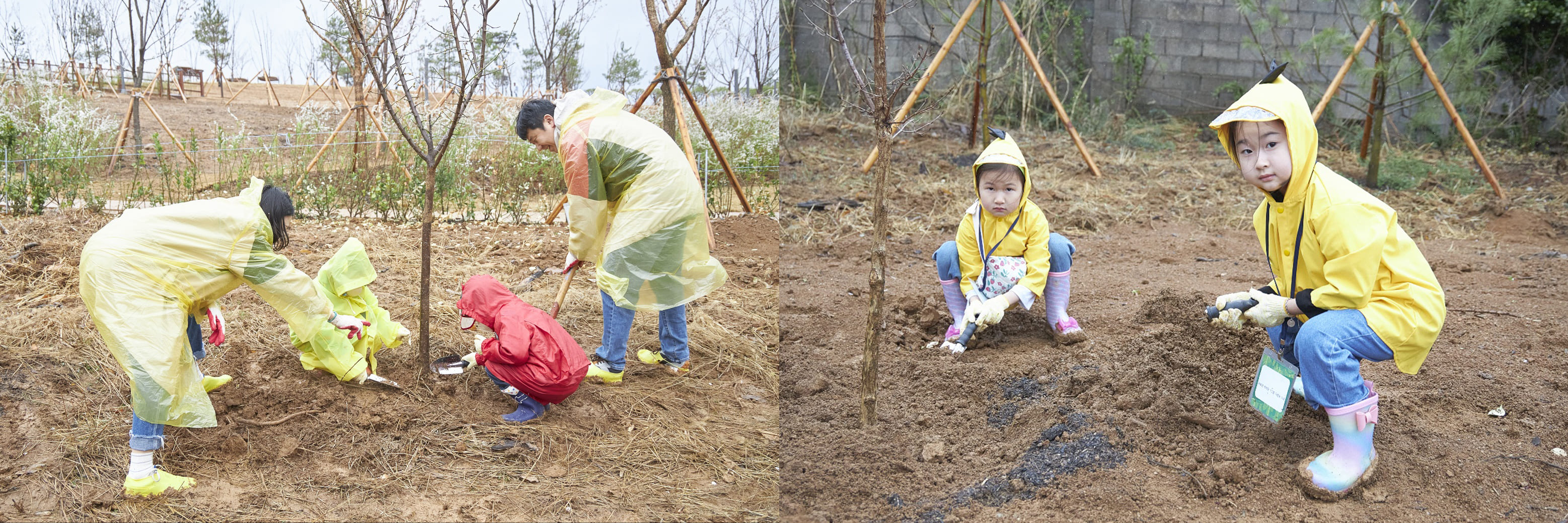 (좌) 보령 직원의 가족이 식수하는 모습, (우) 보령 직원의 자녀들이 식수하는 모습